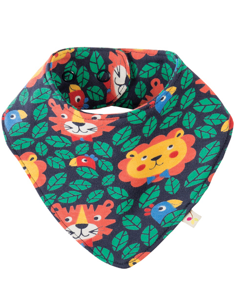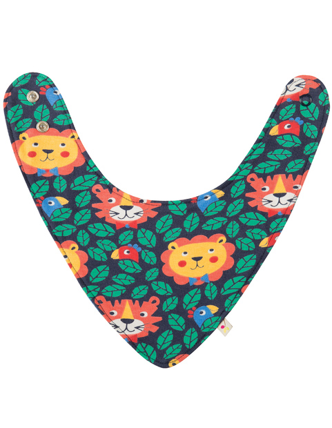 Printed dribble bib with popper fastening.