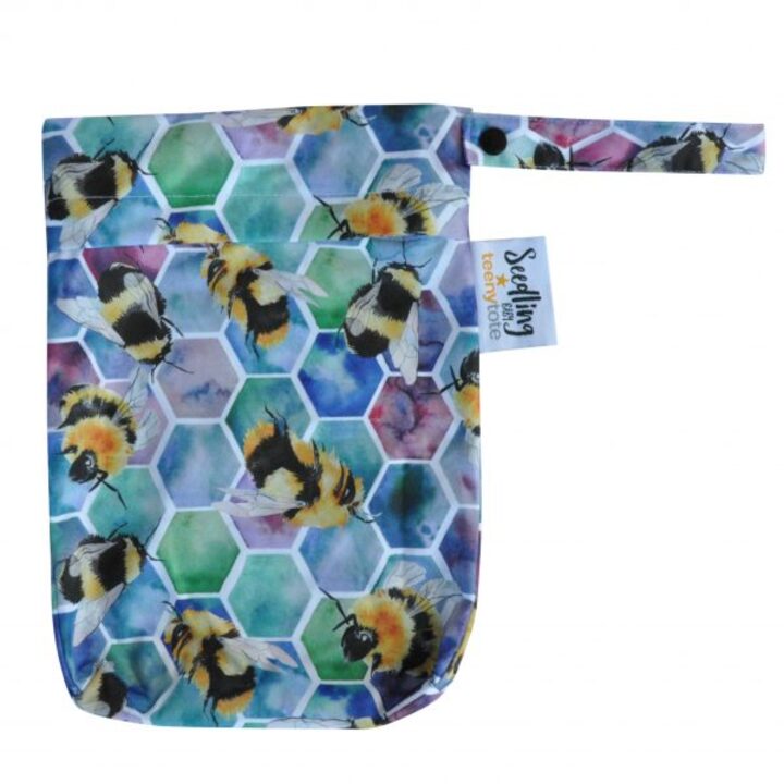 Seedling Baby Teeny Tote is a small wet bag, perfect for 1-2 reusable nappies, toiletries, swimming gear, training pants, make-up or small toys. Has a snap hanging handle and measures 20cm x 30cm.